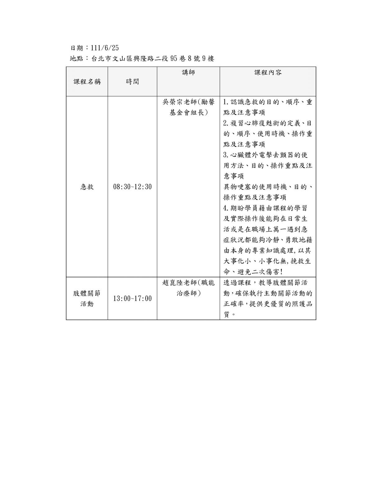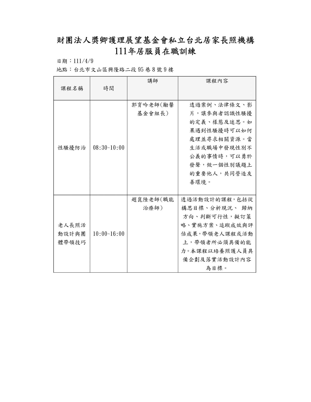 111年度台北居服員在職教育訓練(111年4月9日,6月25日)