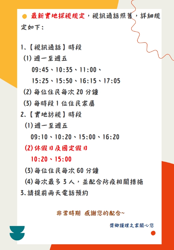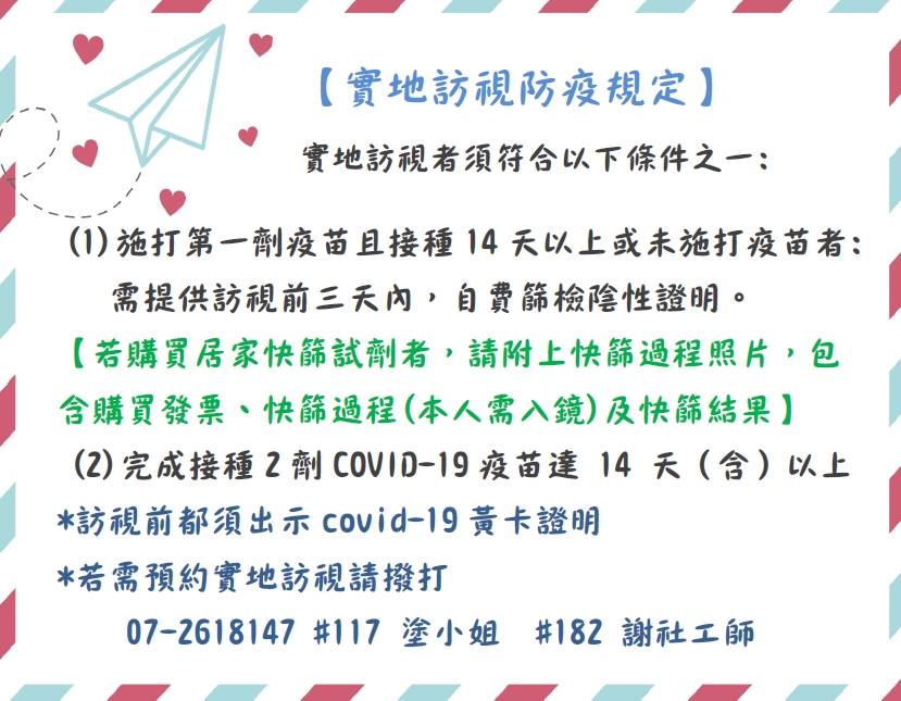 機構為配合疫情指揮中心相關規定,即日起有條件開放探視,並維持原視訊訪視方式。