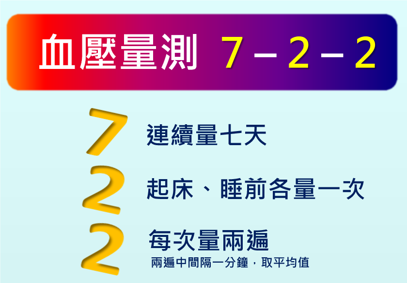 血壓不是固定的數值,會隨著時間、情緒、季節有些許變化,正常血壓值應等於或小於120/80mmHg,當血壓達130/85 mmHg即有偏高情形,140/90 mmHg以上就代表有高血壓,而且高血壓可能造成很多後遺症,會影響到腦部、心臟、腎臟和眼睛等。台灣高血壓學會理事長高憲立醫師表示,很多人到醫院看病時才順便量血壓,這只能表示當時的血壓,並不是長期的血壓狀況,而且民眾到了醫院通常比較緊張,血壓會升高,恐怕不準確。為了要讓更多民眾注意到自己的血壓,如何正確測得血壓,台灣高血壓學會持續推廣居家血壓量測及722原則:「7」連續七天量測、「2」早上起床後、晚上睡覺前各量一次、「2」每次量兩遍,可以清楚掌握自己的血壓狀況。