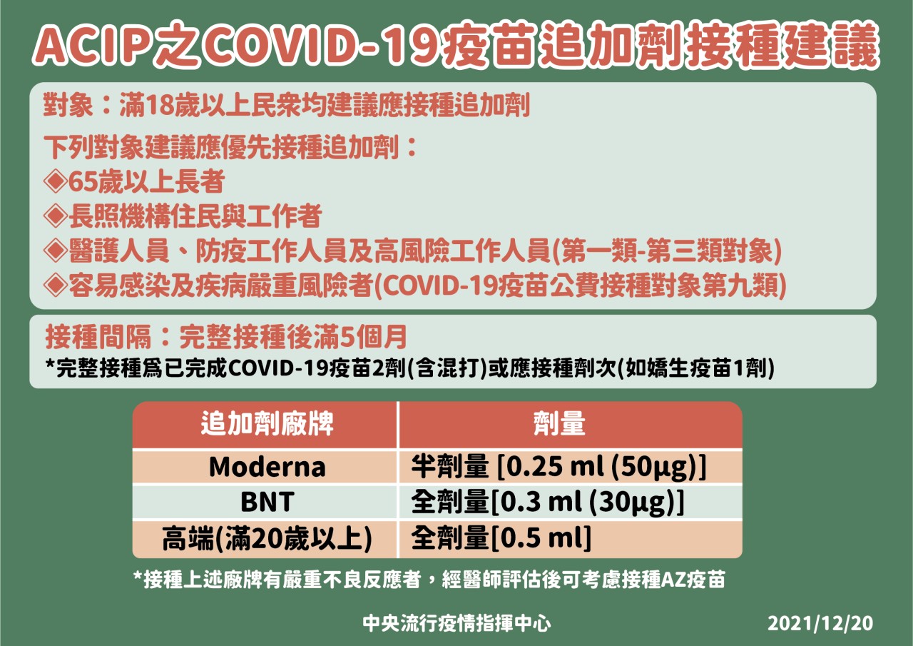(三)已完成基礎劑接種且間隔滿5個月之18歲以上民眾,應接種追加劑(Booster dose),建議優先接種mRNA疫苗(如Moderna、BNT)或次單位蛋白質疫苗(如高端),以獲得充足之免疫保護力。