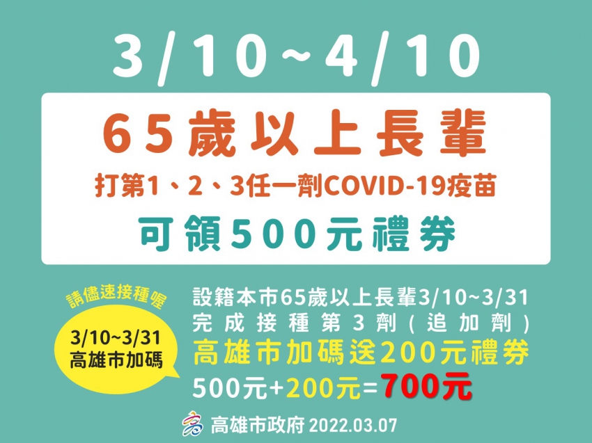 111/03/10~111/04/10 65歲以上長輩施打任一劑COVID-19疫苗可領500元禮卷