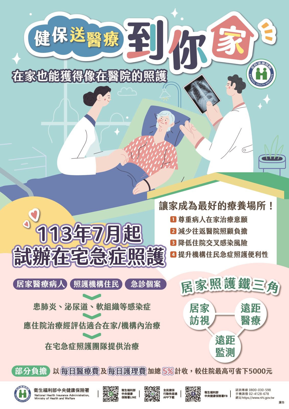 7月1日開始推動「在宅急症照護試辦計畫」,由醫師、護理師、藥師及呼吸治療師組成照護小組共同提供照護,讓因肺炎、尿路感染或軟組織感染而需要住院接受抗生素治療的病患,可以選擇留在家裡或照護機構內接受治療,並搭配遠距醫療、遠端生命徵象監測設備及床邊檢測。