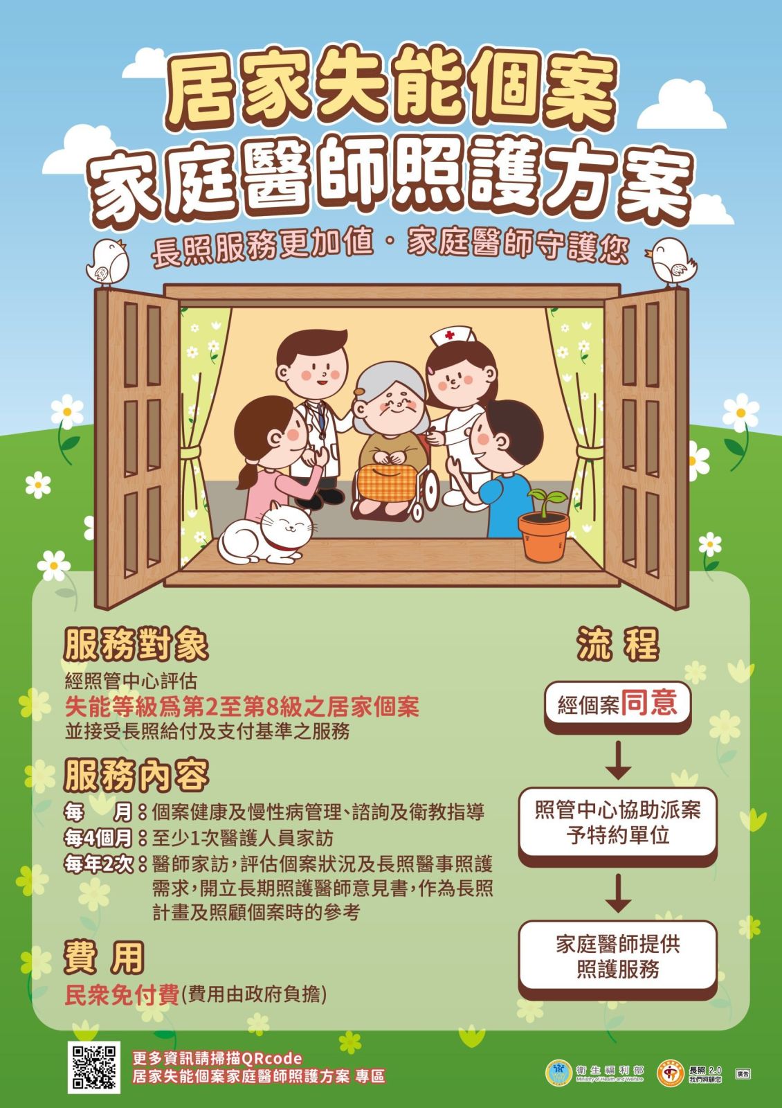 經照管中心評估失能等級符合2-8級長照個案皆可免費使用居家失能個案家庭醫師照護方案服務,詳細聯絡資訊請至高雄市長期照顧中心網站(